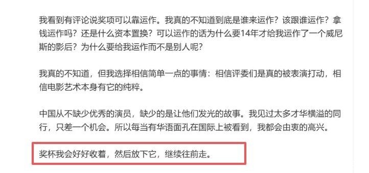 对此,她在威尼斯领奖后不久便公开回应:“我走的从来不是弯道,是一级一级向上攀爬的楼梯,每一阶都有我的指纹和脚印。”